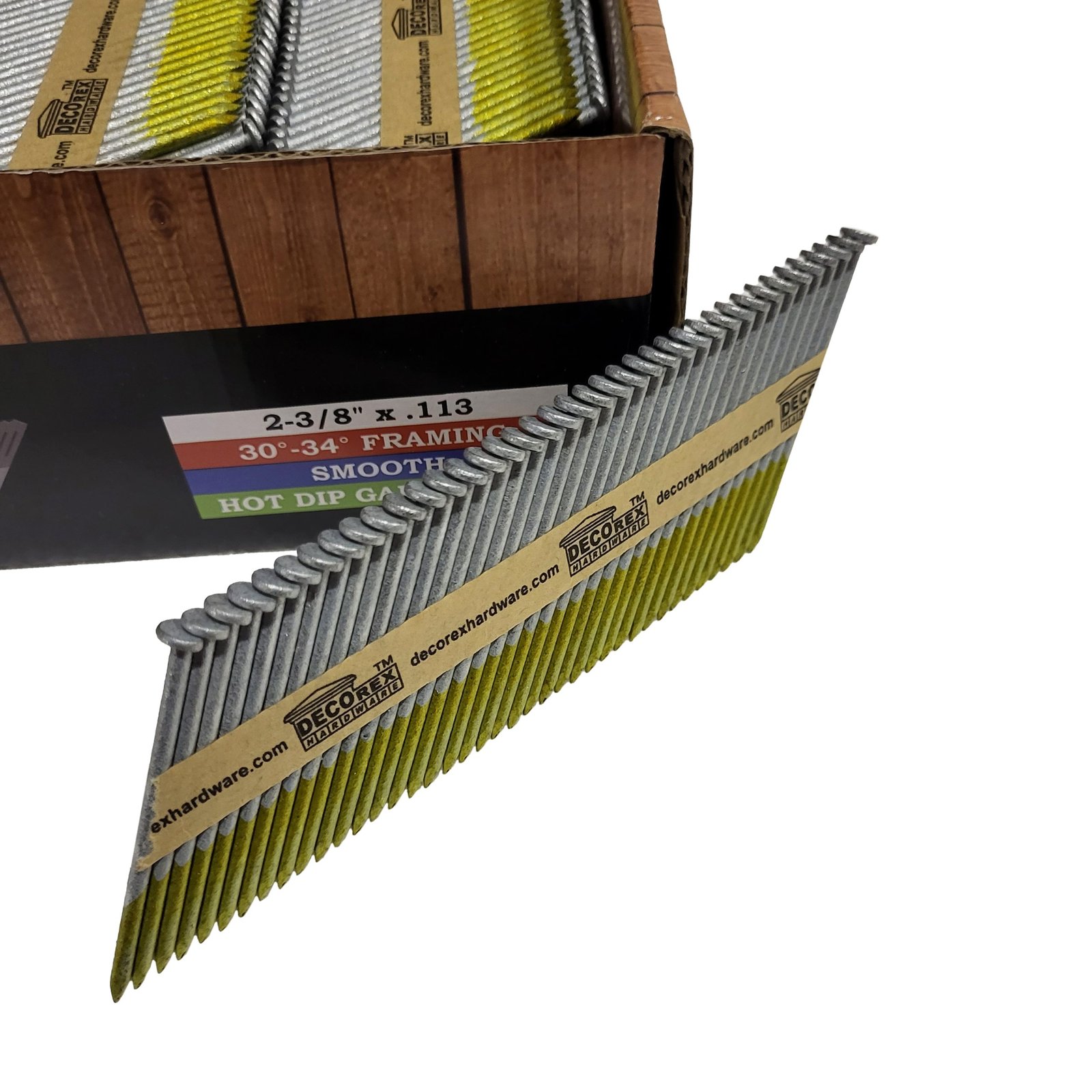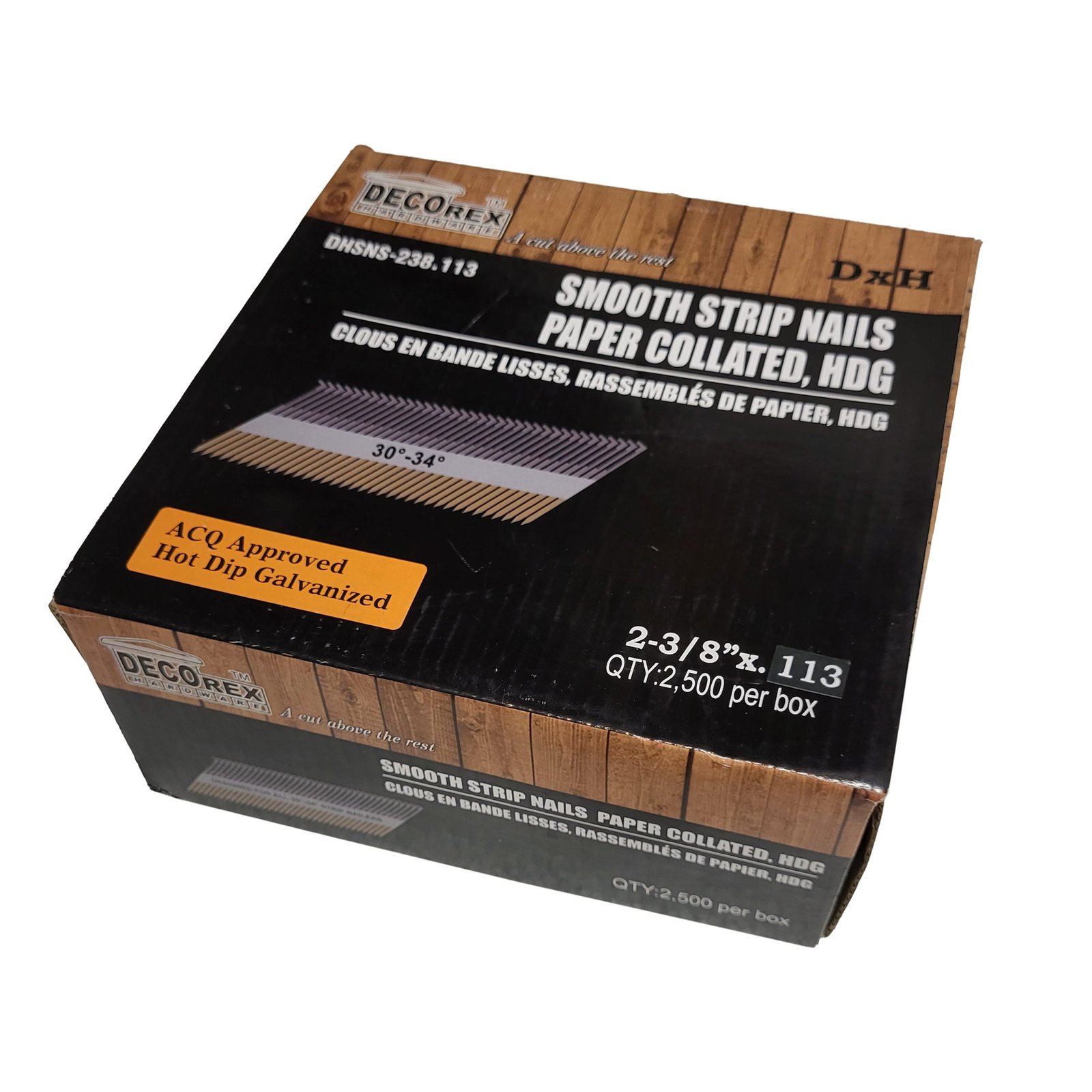2-3/8″ x .113″ Smooth Shank Strip Nails, Paper Collated, HDG (30-34 Degree) – 2500pcs box Are you starting a new decking project? You need reliable materials? Search no further! Decorex Hardware 2-3/8″ x .113 SMOOTH Shank Strip Nails are created to give your construction reliability for many years to come. We make sure that even our smallest product meets your requirements. In combination with products from the Decorex Hardware family you will create the design of your dreams.