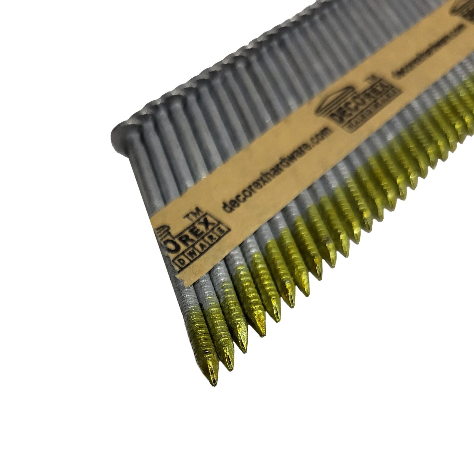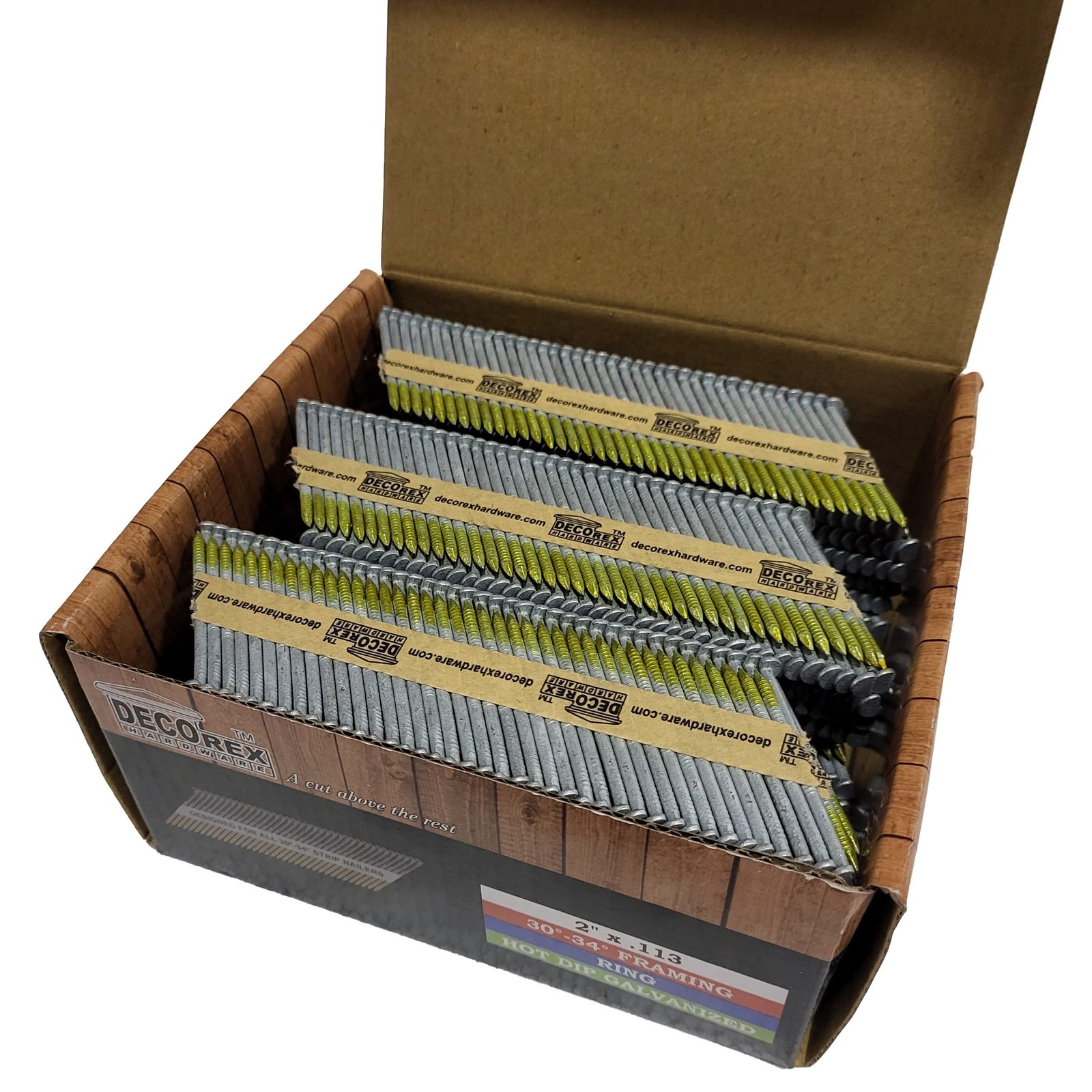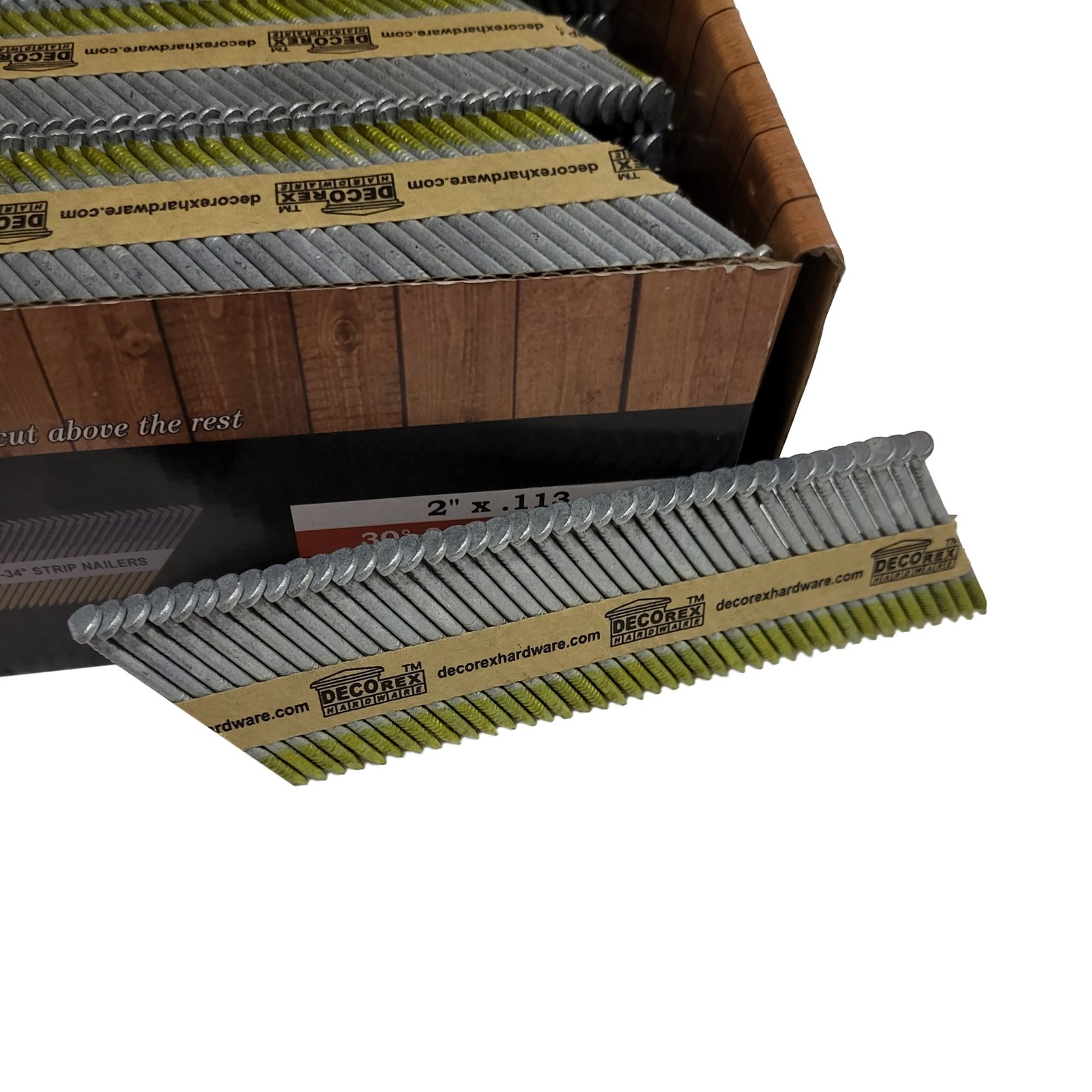 2″ x .113″ Ring Shank Strip Nails, Paper Collated, HDG (30-34 Degree) – 2500pcs box Are you starting a new decking project? You need reliable materials? Search no further! Decorex Hardware 2″ x .113″ RING Shank Strip Nails are created to give your construction reliability for many years to come. We make sure that even our smallest product meets your requirements. In combination with products from the Decorex Hardware family you will create the design of your dreams.
