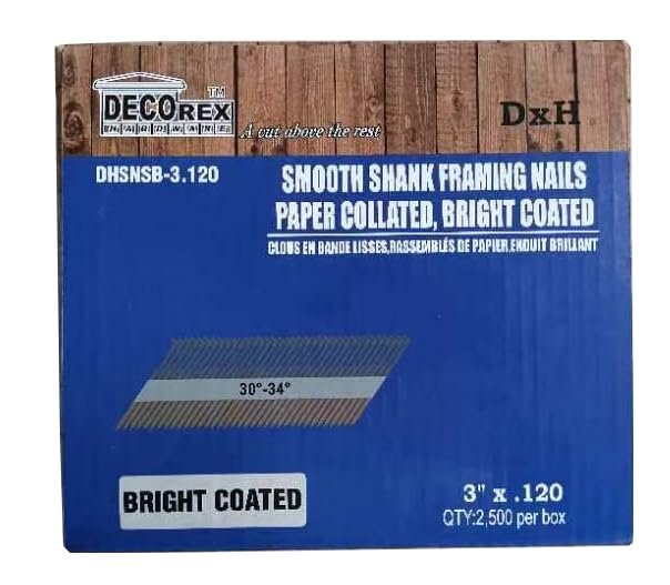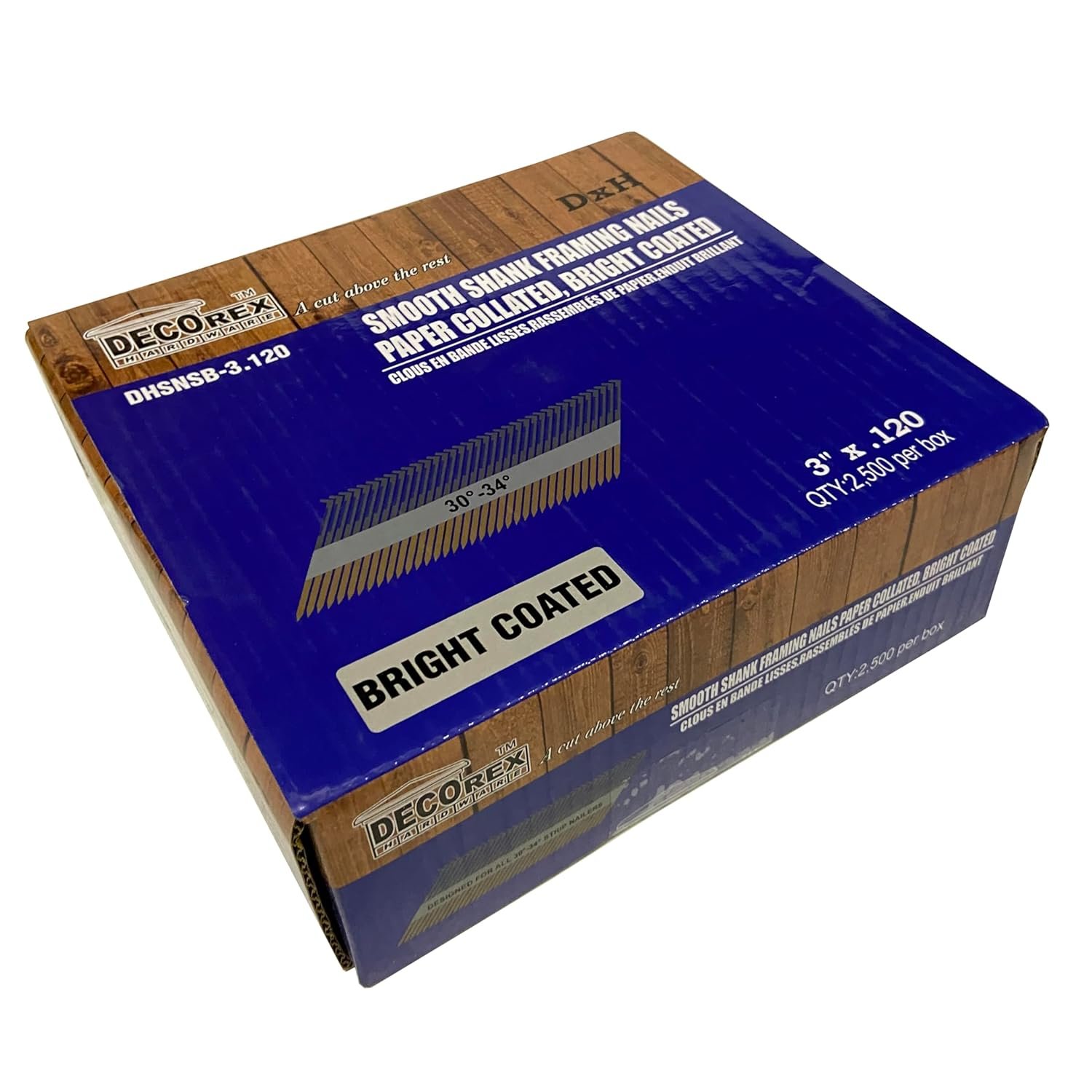 3″ x .120 Smooth Shank Framing Nails, Paper Strip Collated, Clipped Head, Bright Coated Finish (30-34 Degree) – 2500pcs Box (DHSNSB-3.120)