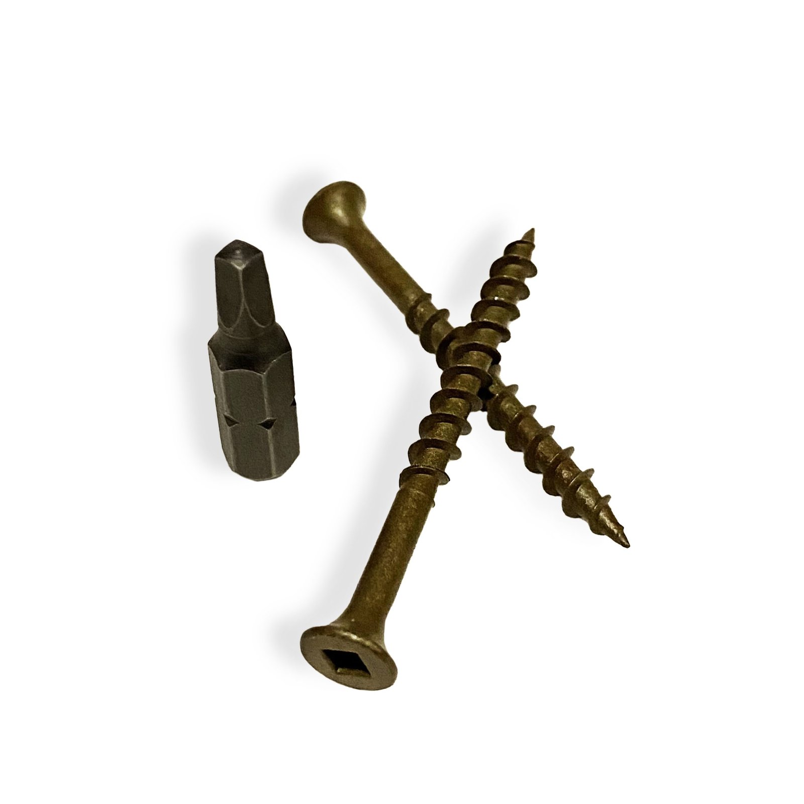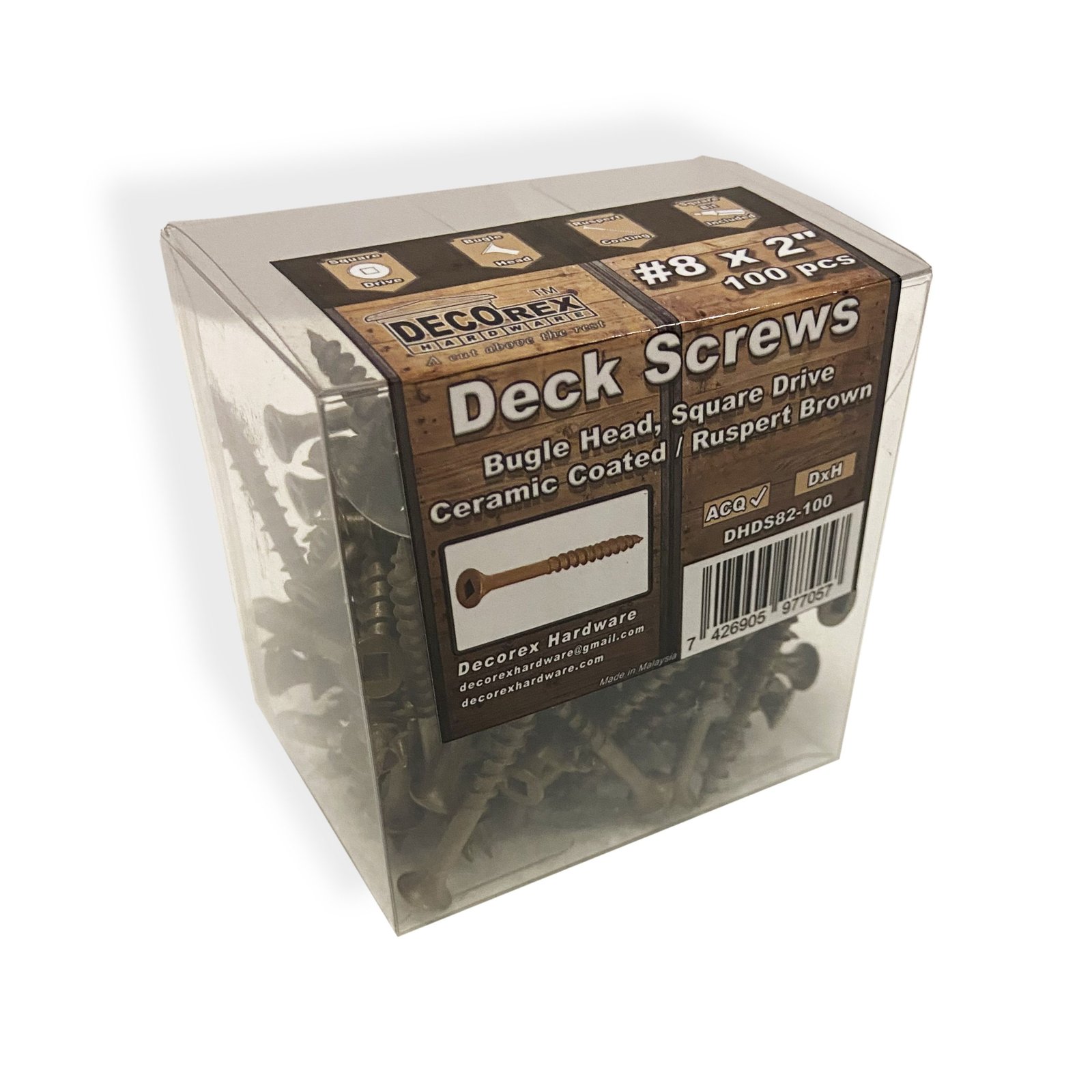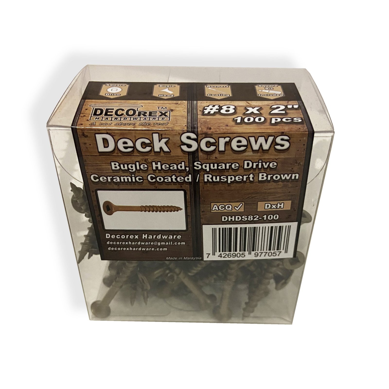 Are you starting a new decking project? You need reliable materials? Search no further! Decorex Hardware #8 x 2″ Deck Screws are created to give your construction reliability for many years to come. We make sure that even our smallest product meets your requirements. In combination with products from the Decorex Hardware family you will create the design of your dreams. These Decorex Hardware Deck Screws are made for treated wood and are designed to be used with a square drive bit. Square head is superior to Philips head because it doesn’t strip easily. These self-tapping screws have a bugle head and a coarse thread. They are made of steel with a Ruspert Brown finish.