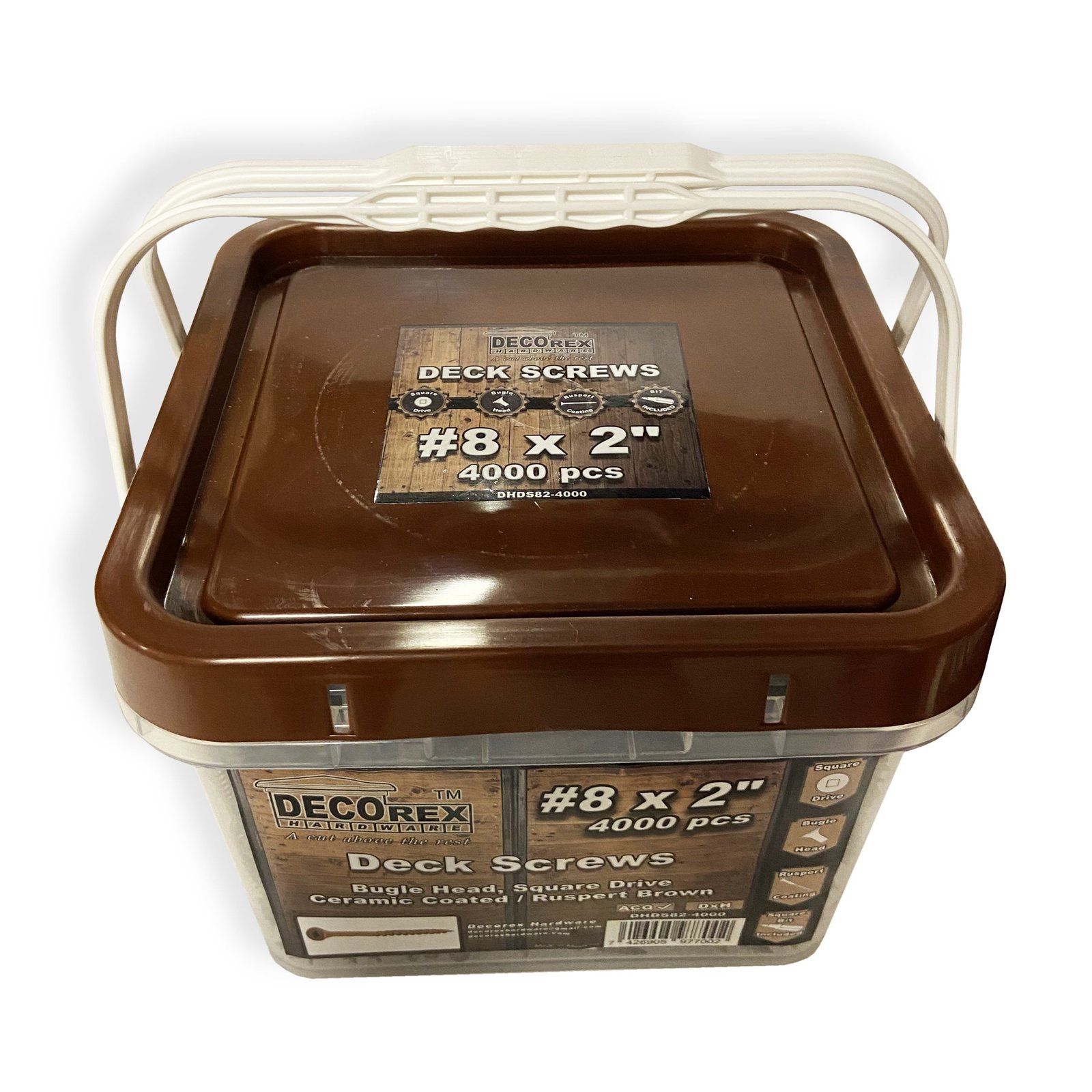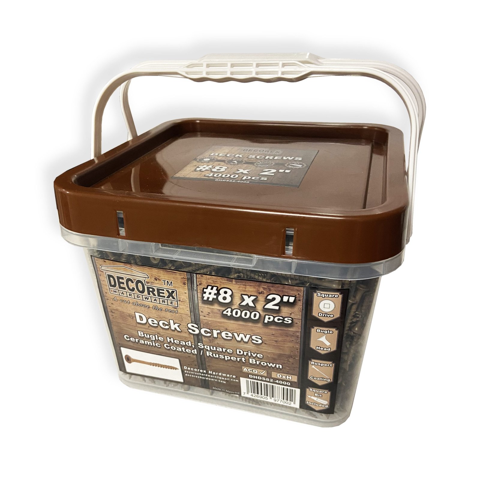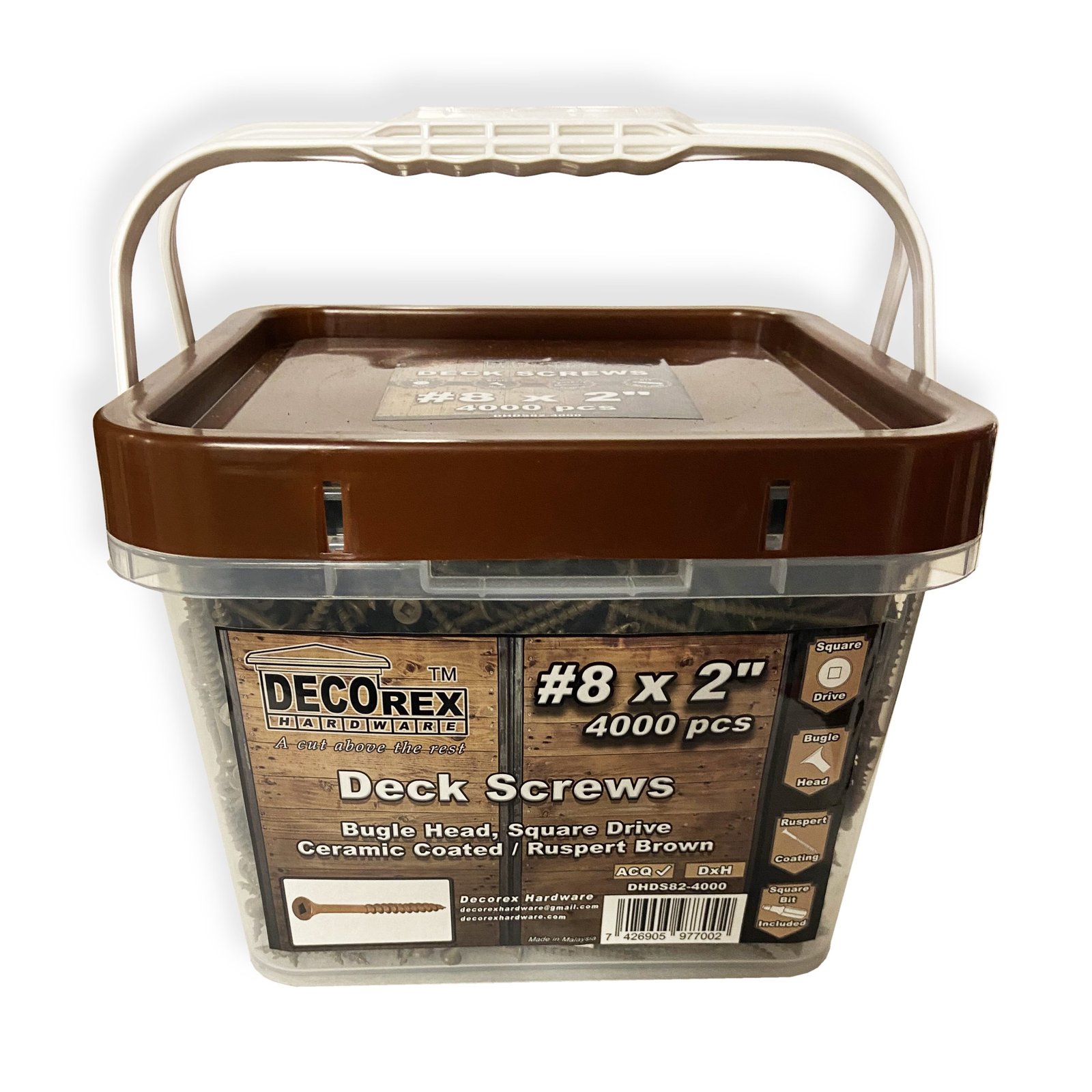 Are you starting a new decking project? You need reliable materials? Search no further! Decorex Hardware #8 x 2″ Deck Screws are created to give your construction reliability for many years to come. We make sure that even our smallest product meets your requirements. In combination with products from the Decorex Hardware family you will create the design of your dreams. These Decorex Hardware Deck Screws are made for treated wood and are designed to be used with a square drive bit. Square head is superior to Philips head because it doesn’t strip easily. These self-tapping screws have a bugle head and a coarse thread. They are made of steel with a Ruspert Brown finish.