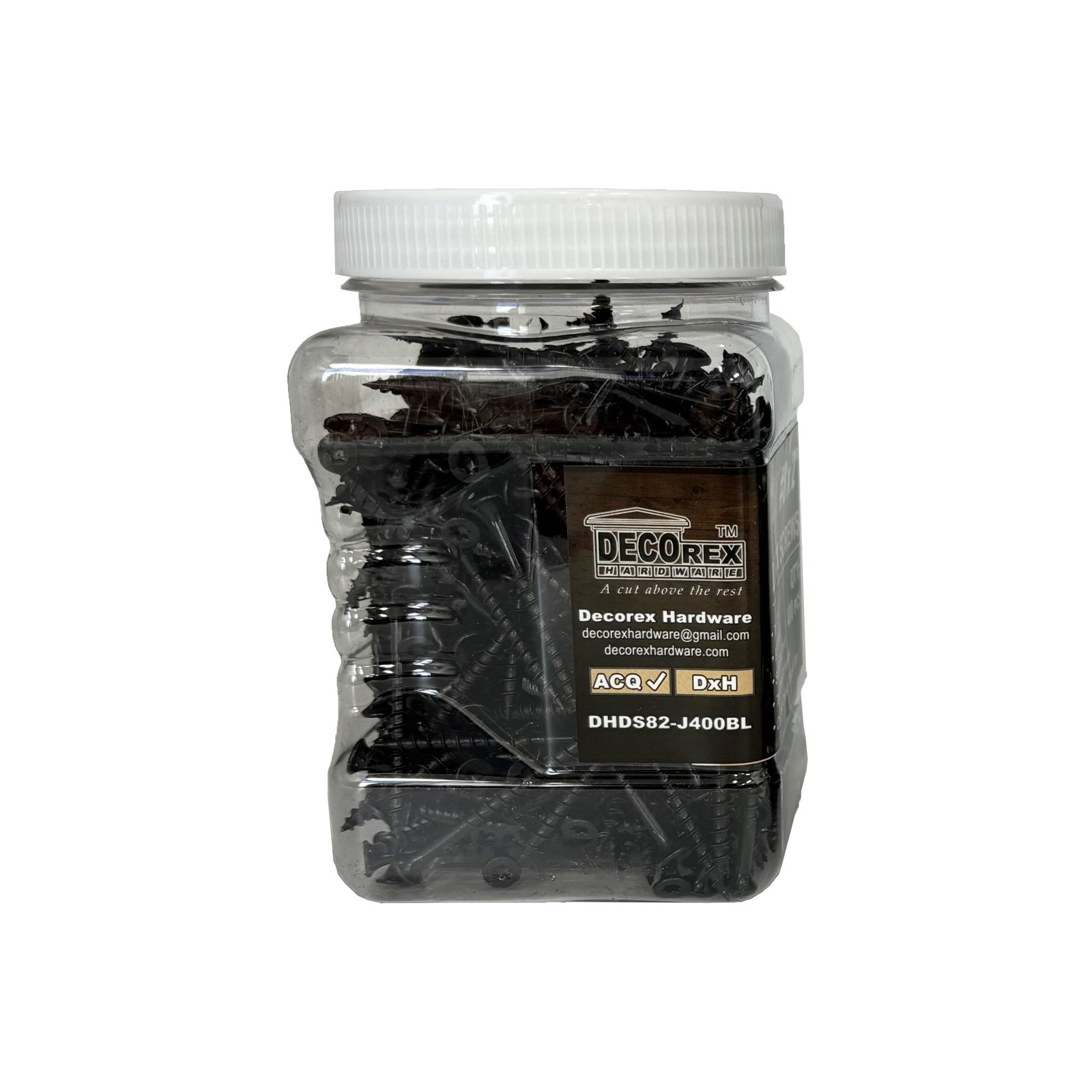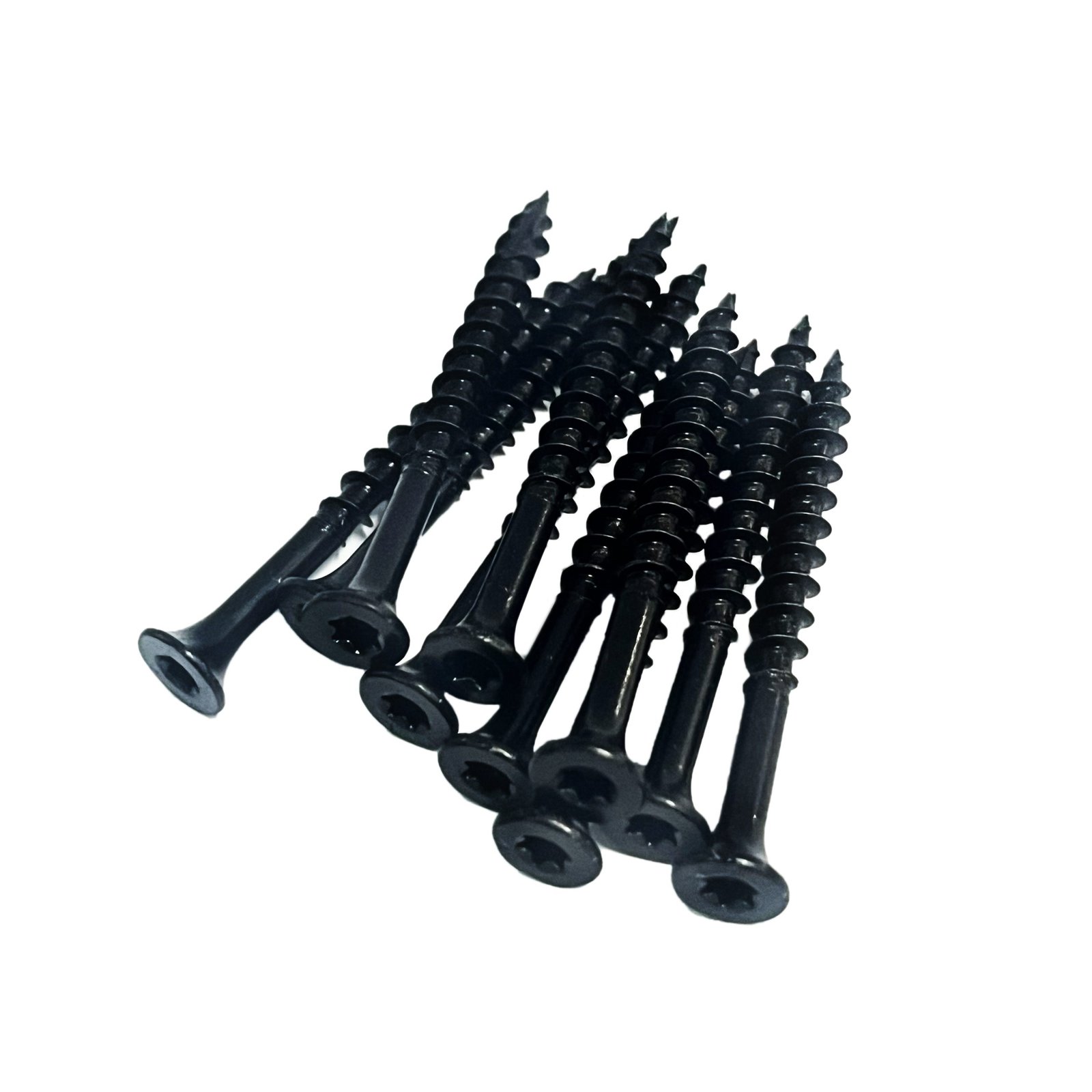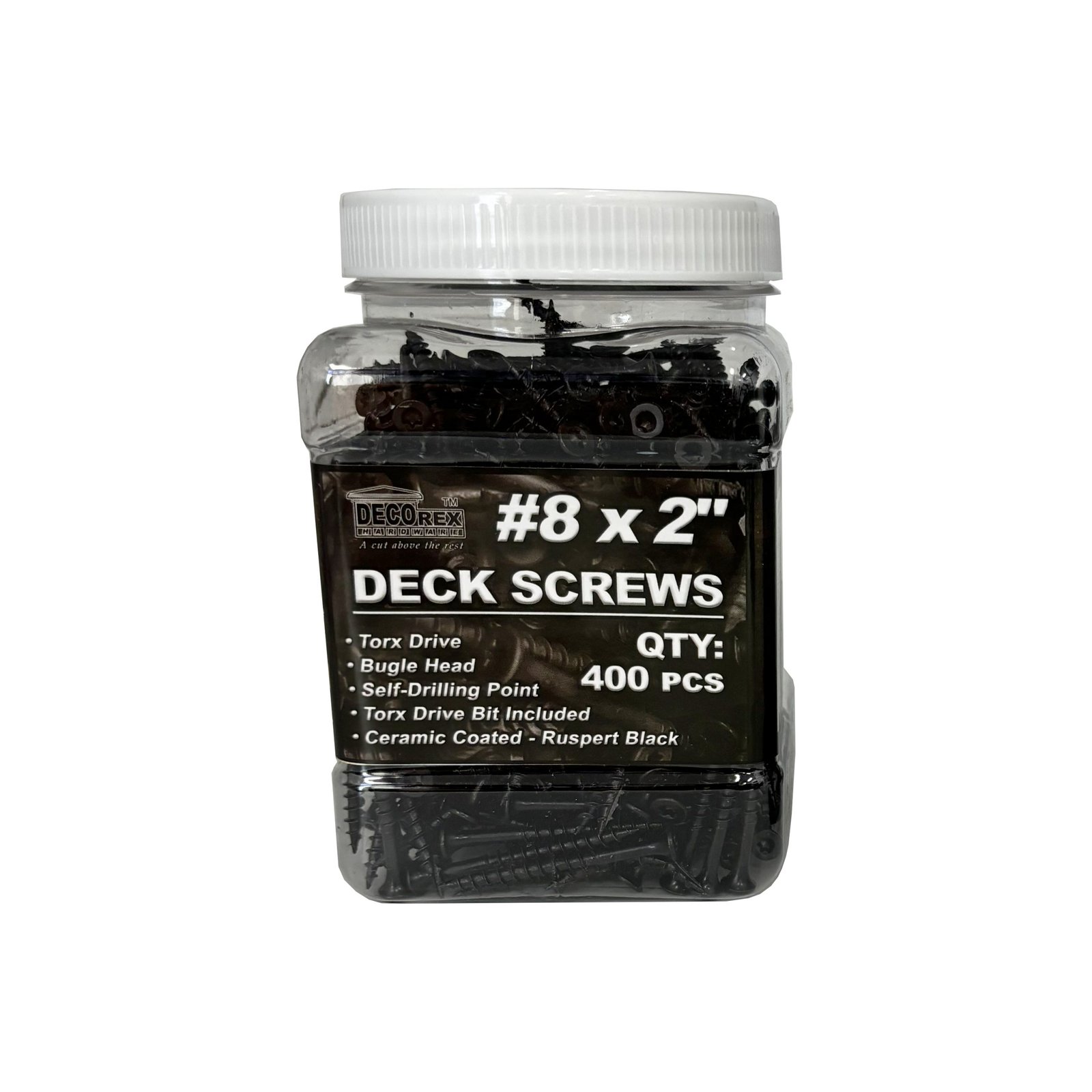 These Decorex Hardware Deck Screws are made for treated wood and are designed to be used with a torx drive bit (Torx Drive Bit Included). These self-drilling screws have a bugle head and a coarse thread. They are made of steel with a Ruspert Black finish.