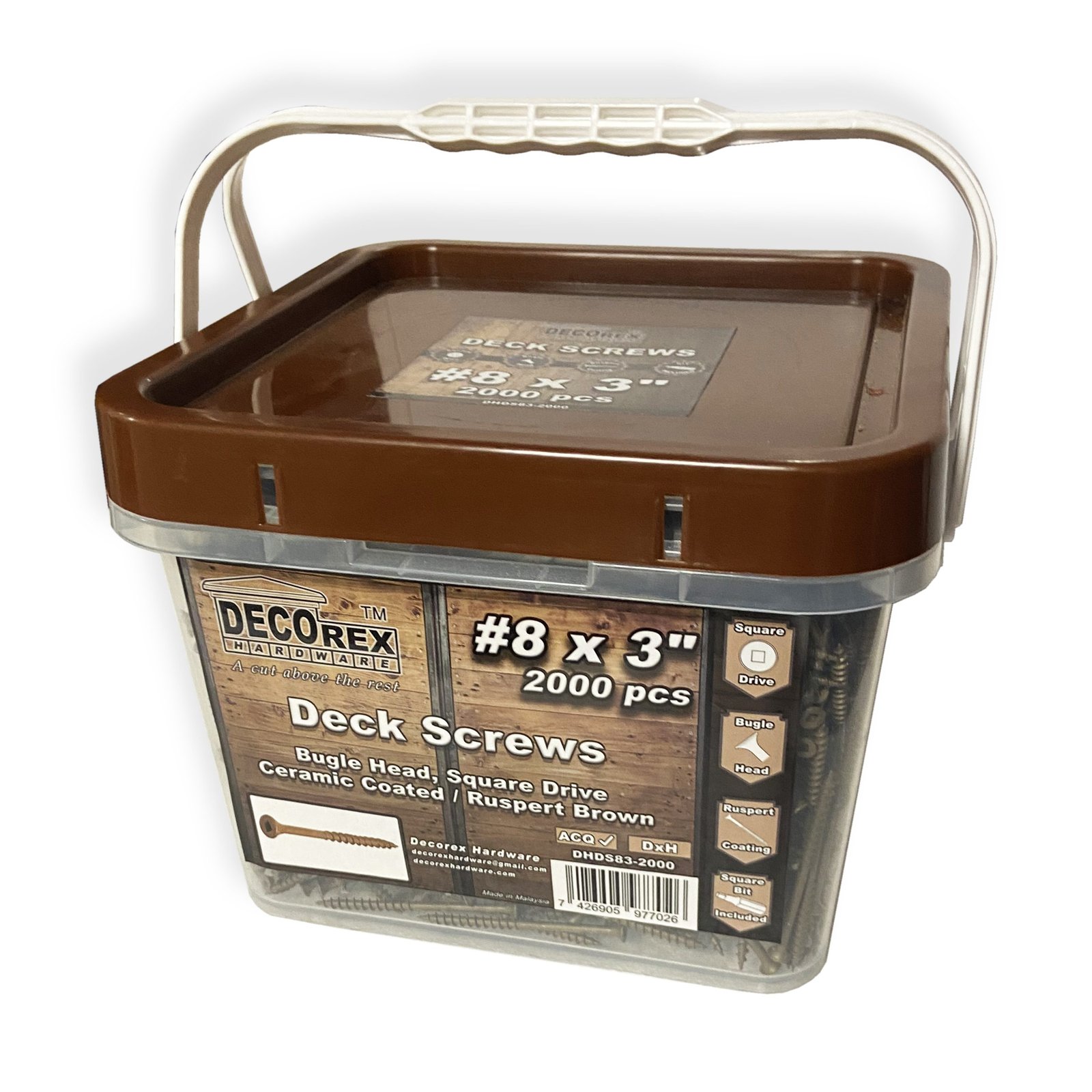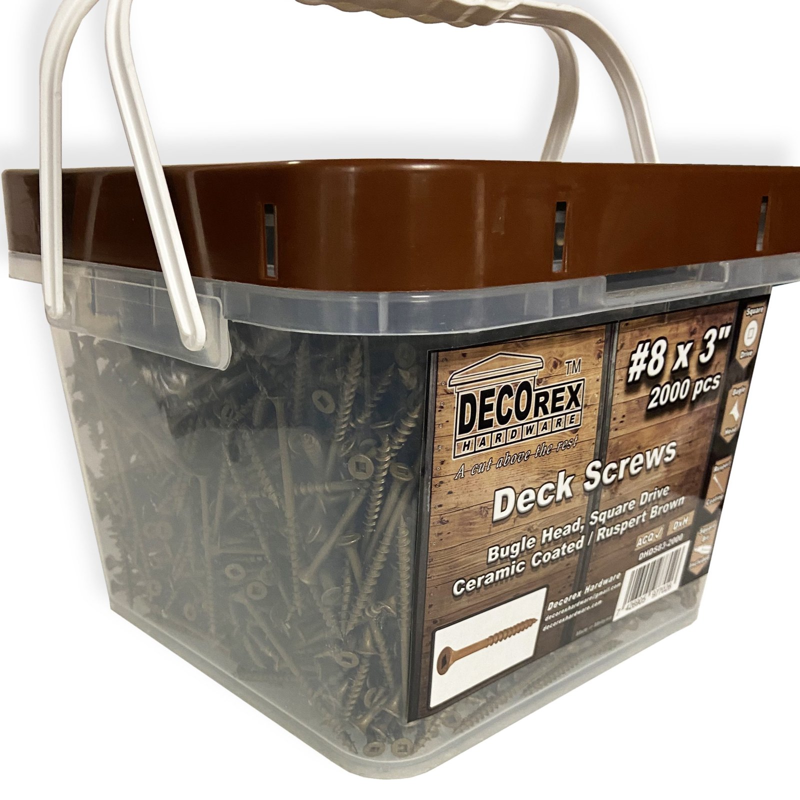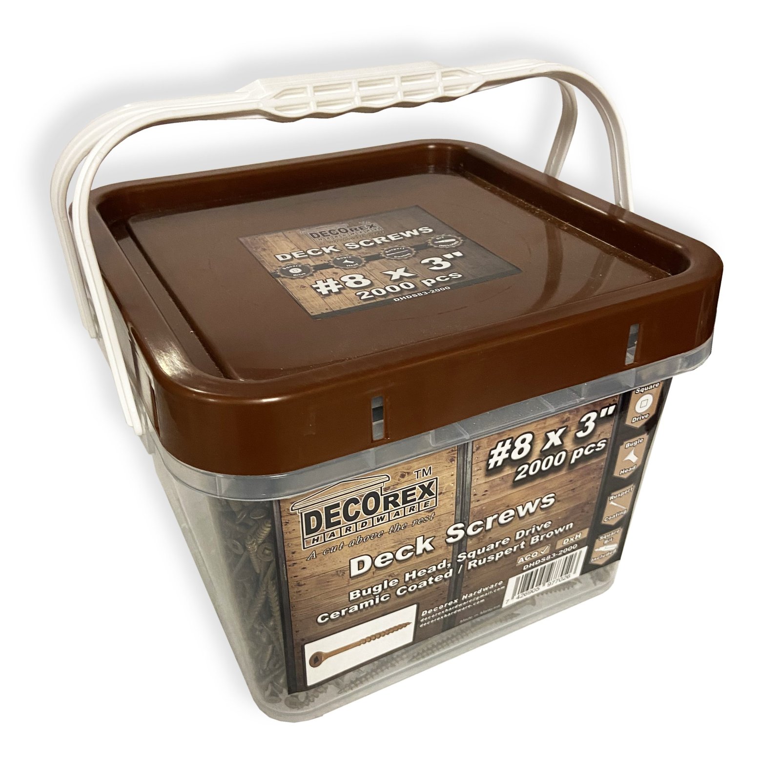 Are you starting a new decking project? You need reliable materials? Search no further! Decorex Hardware #8 x 3″ Deck Screws are created to give your construction reliability for many years to come. We make sure that even our smallest product meets your requirements. In combination with products from the Decorex Hardware family you will create the design of your dreams. These Decorex Hardware Deck Screws are made for treated wood and are designed to be used with a square drive bit. Square head is superior to Philips head because it doesn’t strip easily. These self-tapping screws have a bugle head and a coarse thread. They are made of steel with a Ruspert Brown finish.