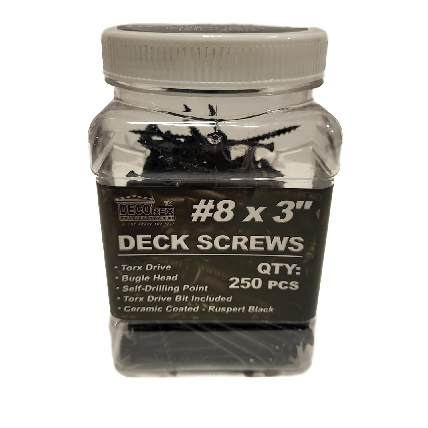 These Decorex Hardware Deck Screws are made for treated wood and are designed to be used with a torx drive bit (Torx Drive Bit Included). These self-drilling screws have a bugle head and a coarse thread. They are made of steel with a Ruspert Black finish.