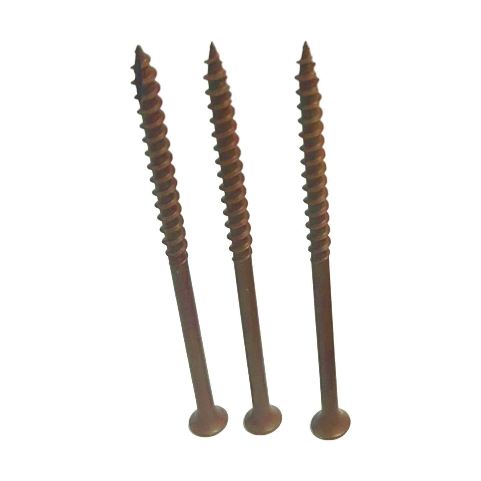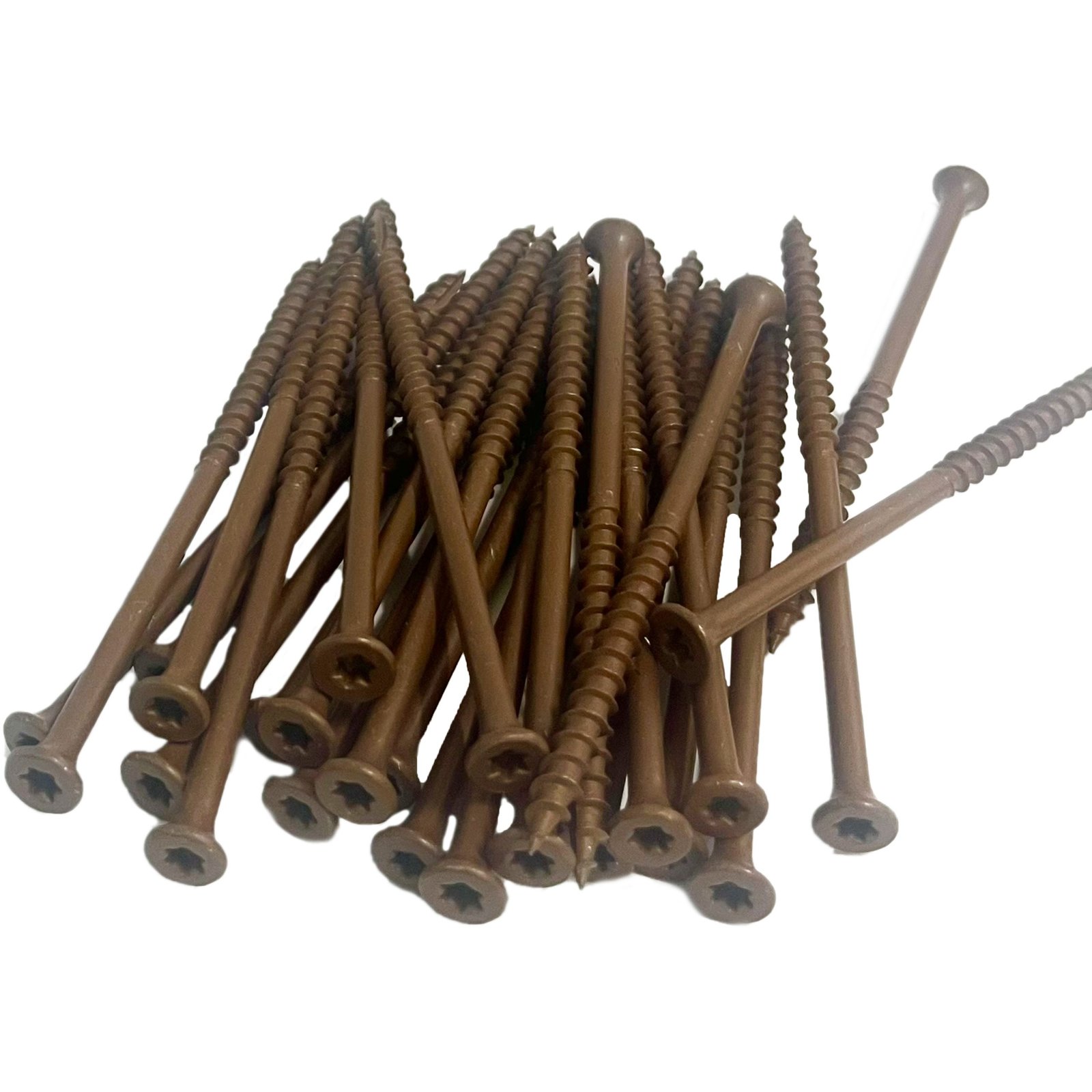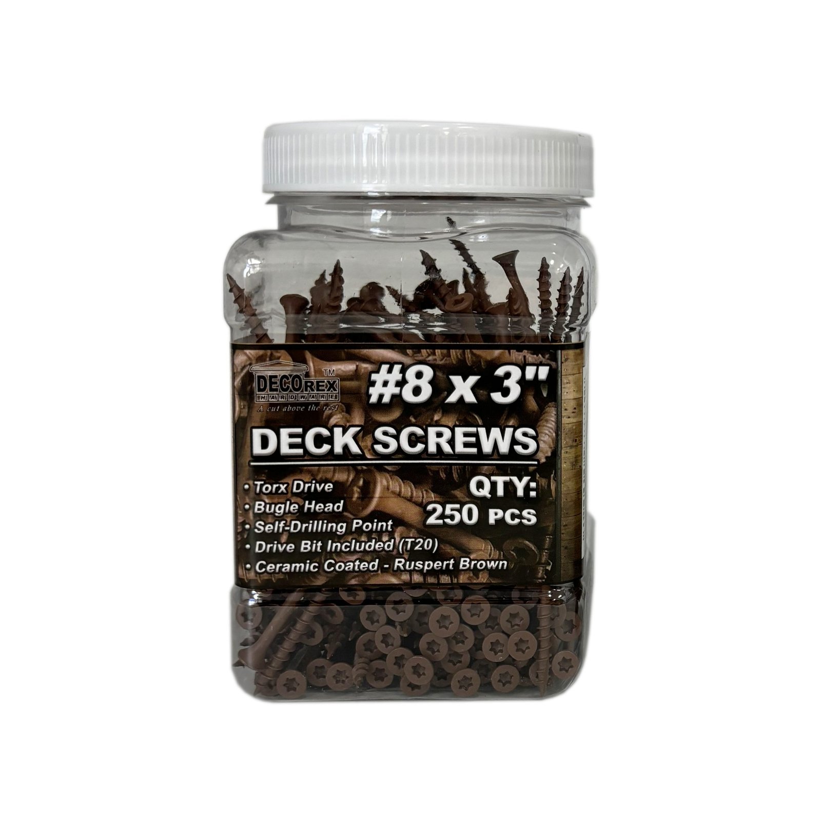 These Decorex Hardware Deck Screws are made for treated wood and are designed to be used with a torx drive bit (Torx Drive Bit Included). These self-drilling screws have a bugle head and a coarse thread. They are made of steel with a Ruspert Brown finish.