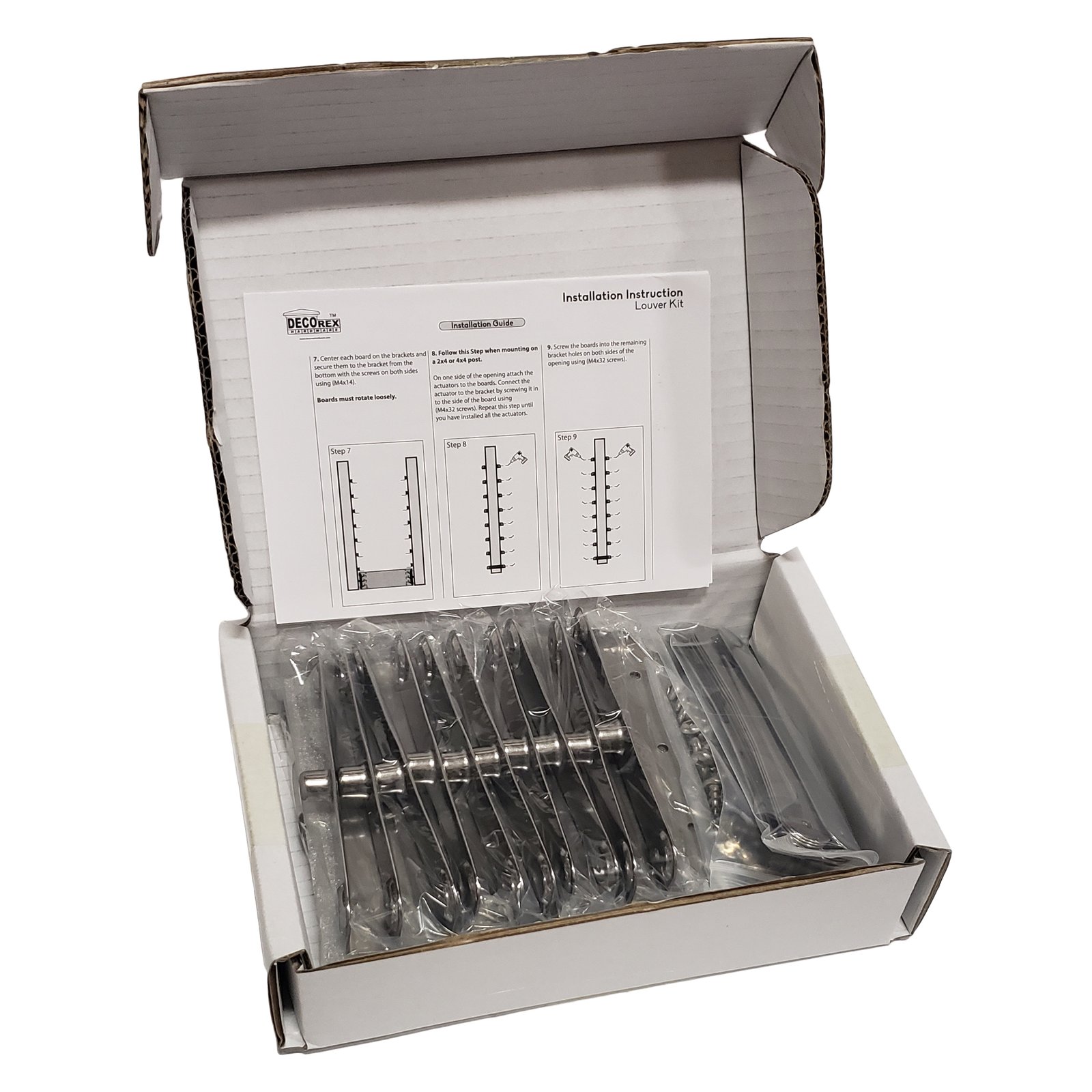 ⦁ Decorex Hardware Louver Kit includes: 10 actuators, 22 brackets and screws