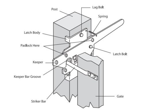 Install latch as shown in the figure. Attach Latch to the Post with the Lag Bolts provided making certain that the Latch Height is set so that the center of the Groove in the Keeper Bar alings with the back rail of the Gate.