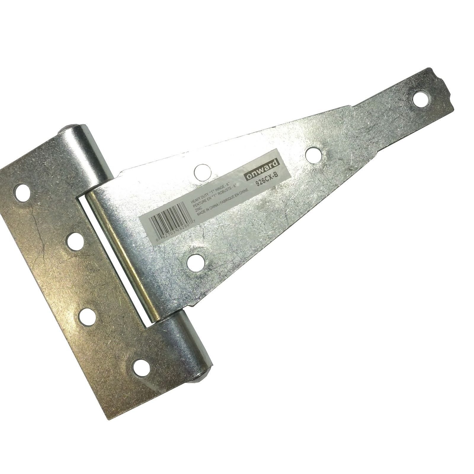 Easy to install, made of steel and zinc plated, Onward Heavy Duty T Hinge – 6″ are ideal for surface applications on doors, gates, sheds and tool boxes. Fixed-pin design  provides 47-pound safe working load