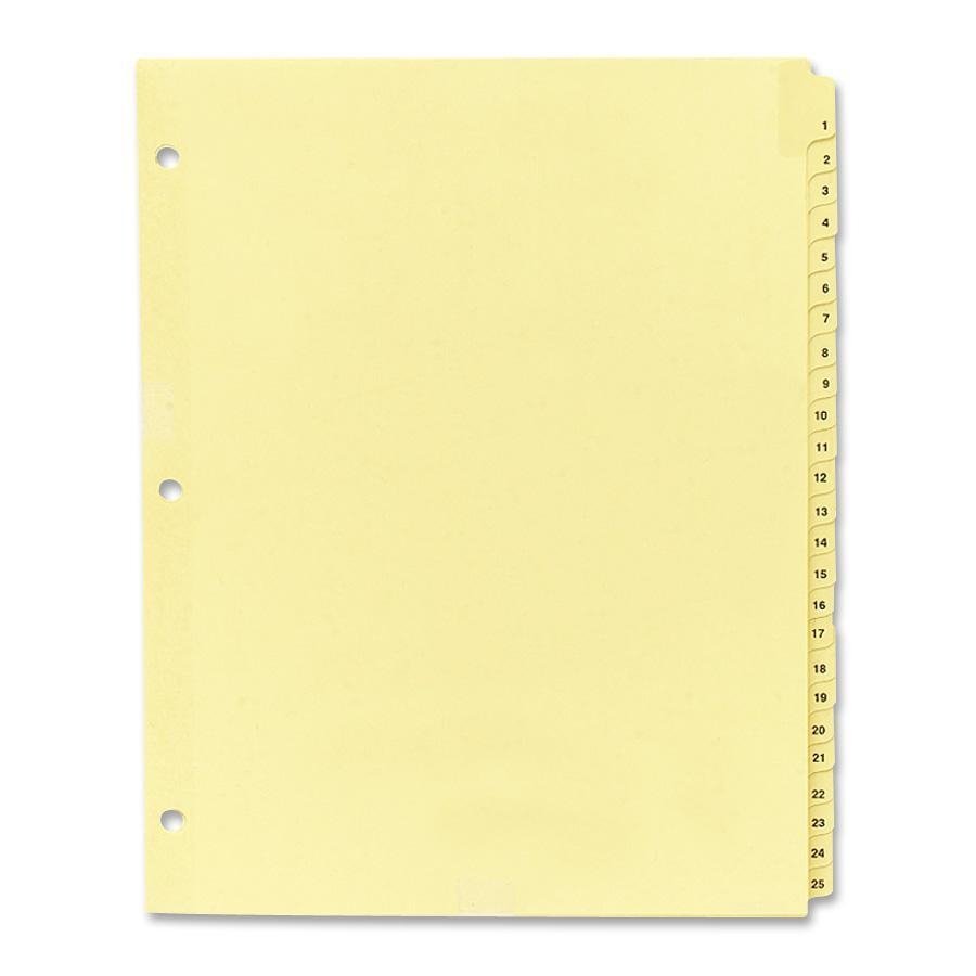 Clear-coated tabs are durable and clearly visible on both sides. Tabs extend 3/8. Heavy-duty paper is reinforced at binding edge. Dividers feature three 9/32″ punched holes, buff-colored paper and numbered index tabs.